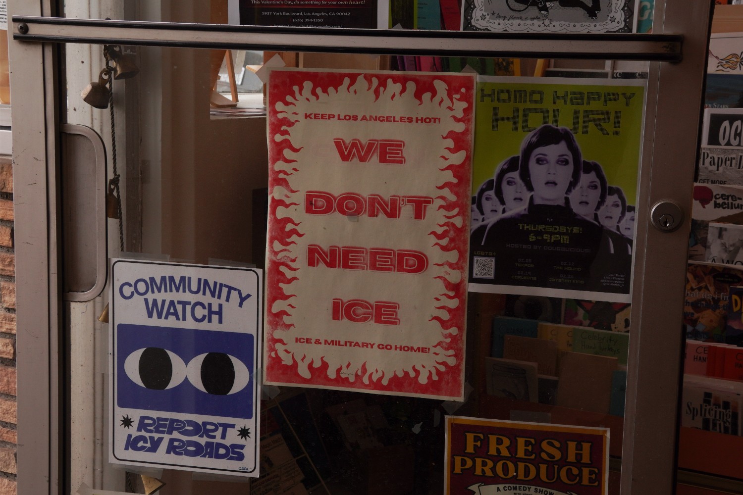 At Pop-Hop Books & Print on York Boulevard, employee Jonathan Hinton said the store displayed hand-painted signs reading “Ice Out of NELA,” and