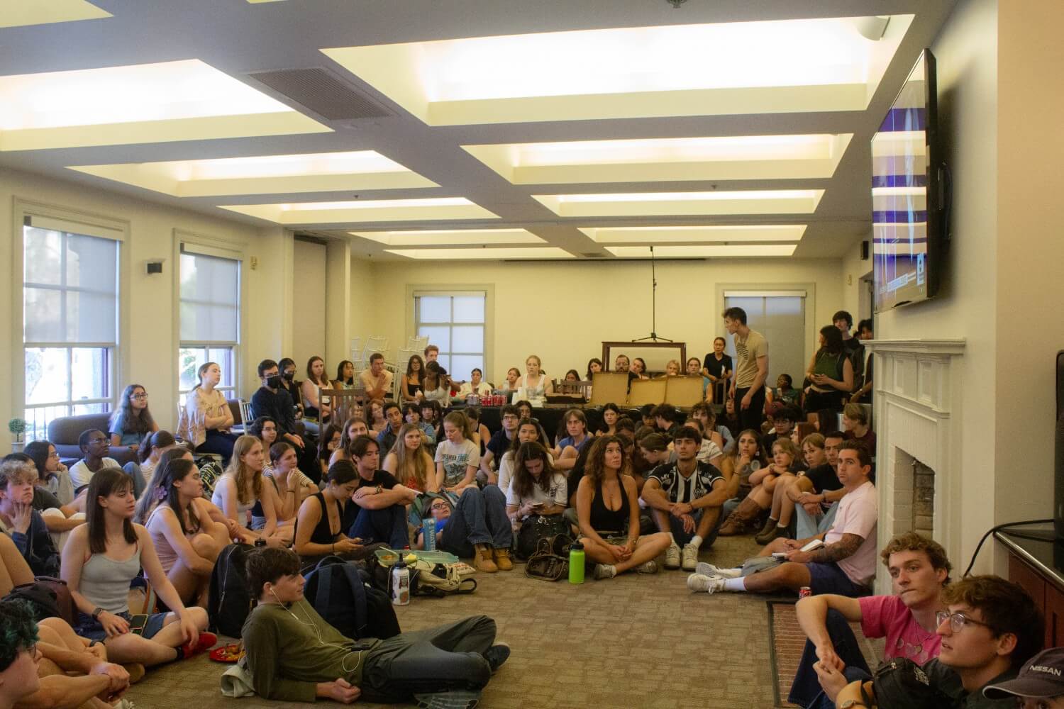 Students gathered to watch the presidential debate between former President Donald Trump and Vice President Kamala Harris hosted by ABC News in Morrison Lounge Sept. 10, at 6 p.m.. Despite the maximum occupancy of 105, the crowd reached up to 120 people at its peak.