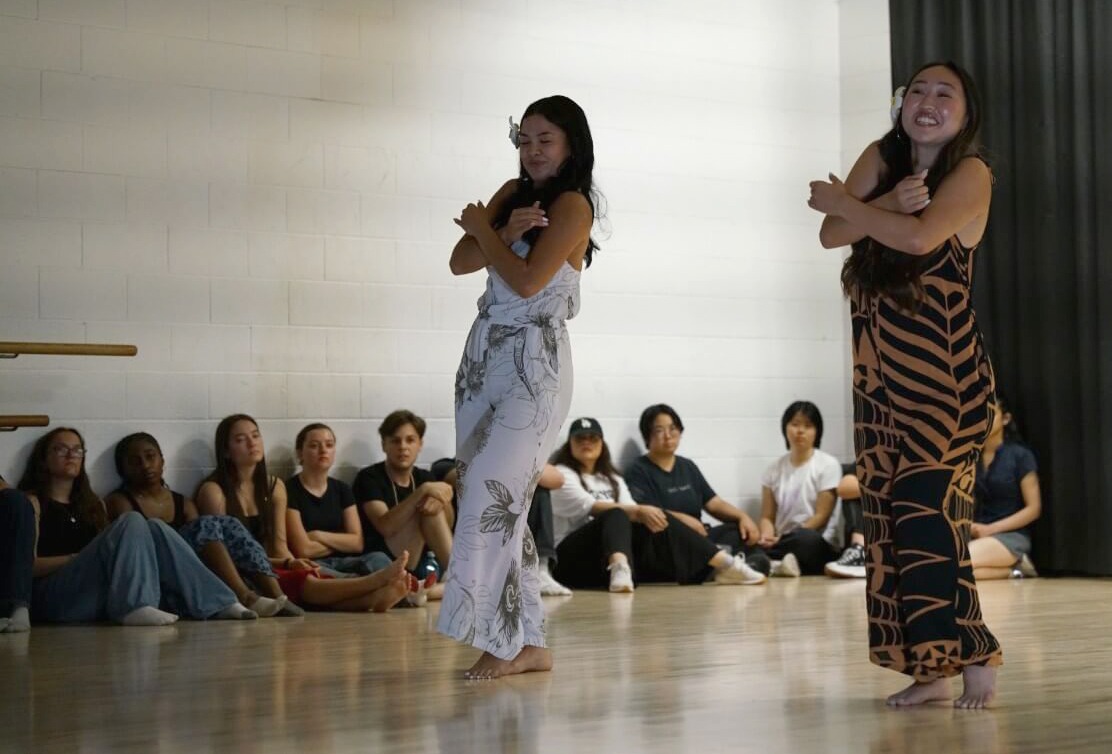 Dominique Cabading (senior) and Dara Tokeshi (senior) Hula dance in the Dance Studio at Occidental College in Los Angeles, CA. March 26, 2026. Anthony Cordova/The Occidental