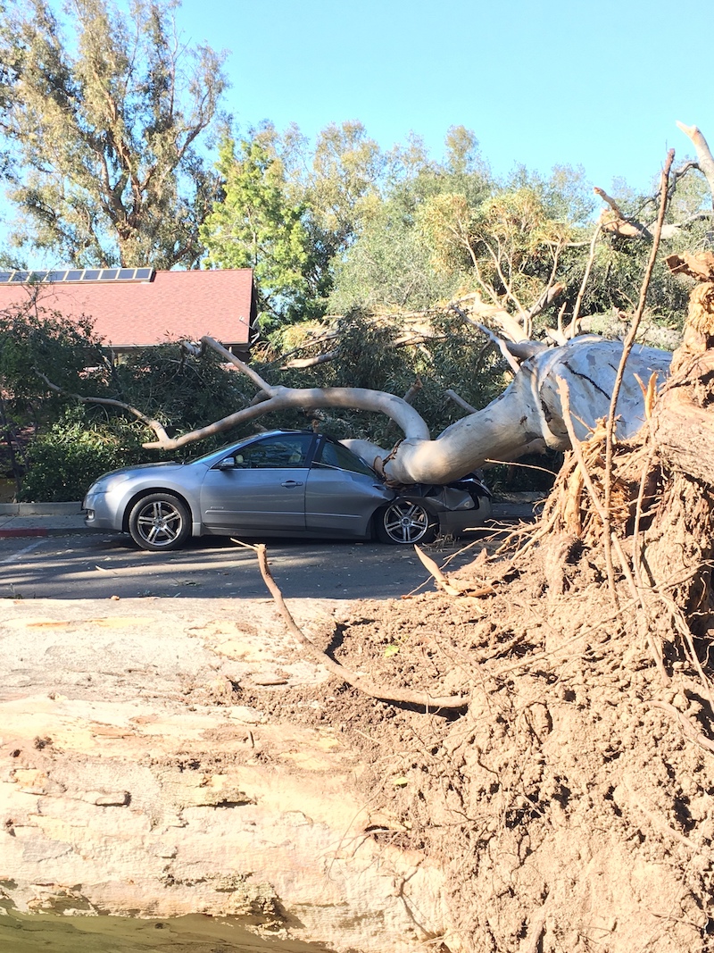 Fallen tree blocks road, damages car
