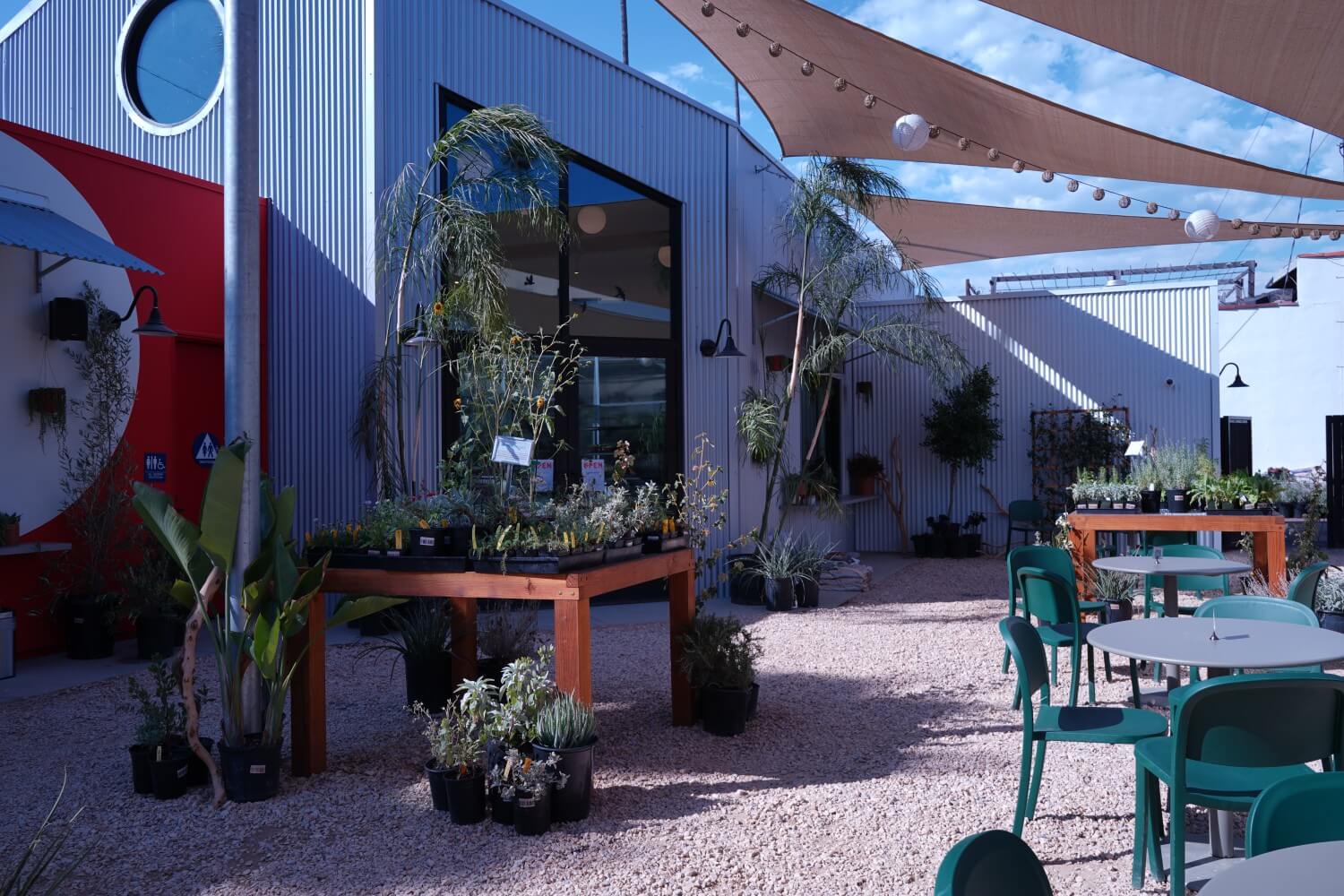 The additional seating outdoors has lights and hanging tarp canopies and according to Brynestad, there is a variety of plants outside the building.