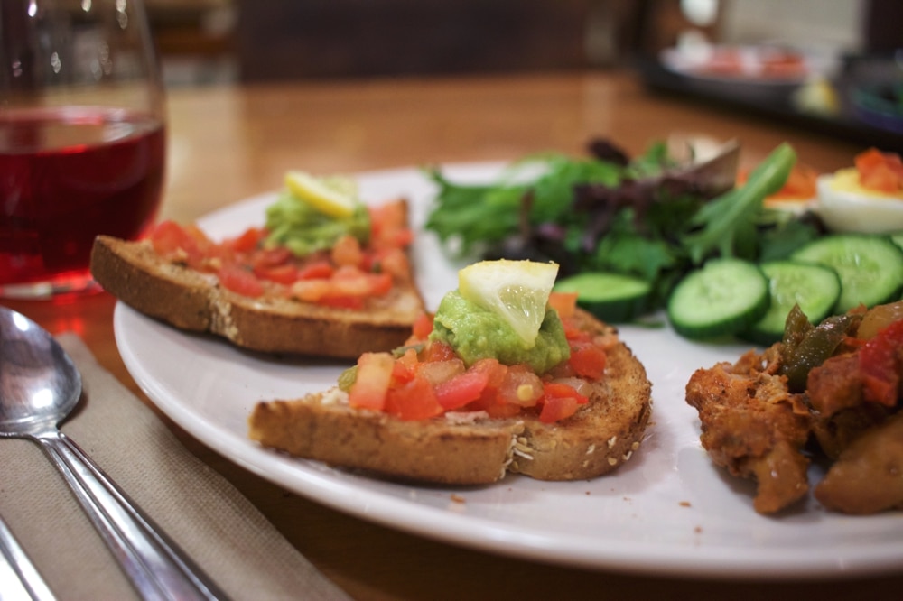 Dinner: Bruschetta with guac/lemon garnish, fajita chicken, mixed green salad, “deviled” egg and cranberry juice.
