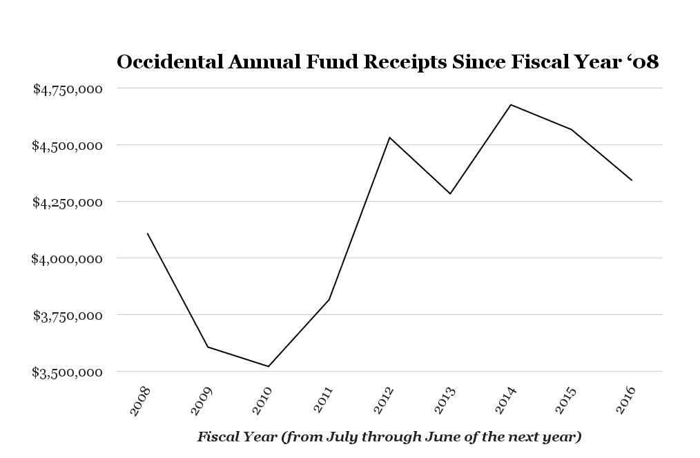 Home Occidental alumni donations unaffected by student activism despite nationwide trend of disengagement Occidental Annual Fund Receipts Since Fiscal Year '08