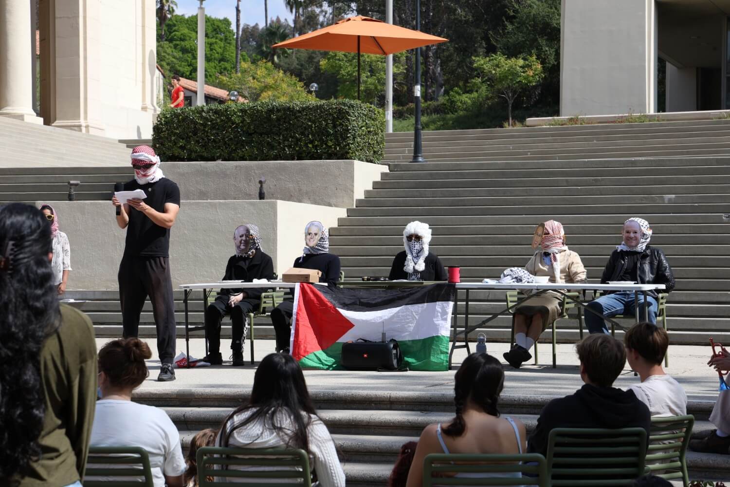 Oxy SJP students, including those acting as the indicted and as witnesses, but also those monitoring around the event, wore surgical masks and keffiyehs throughout the mock trial.
