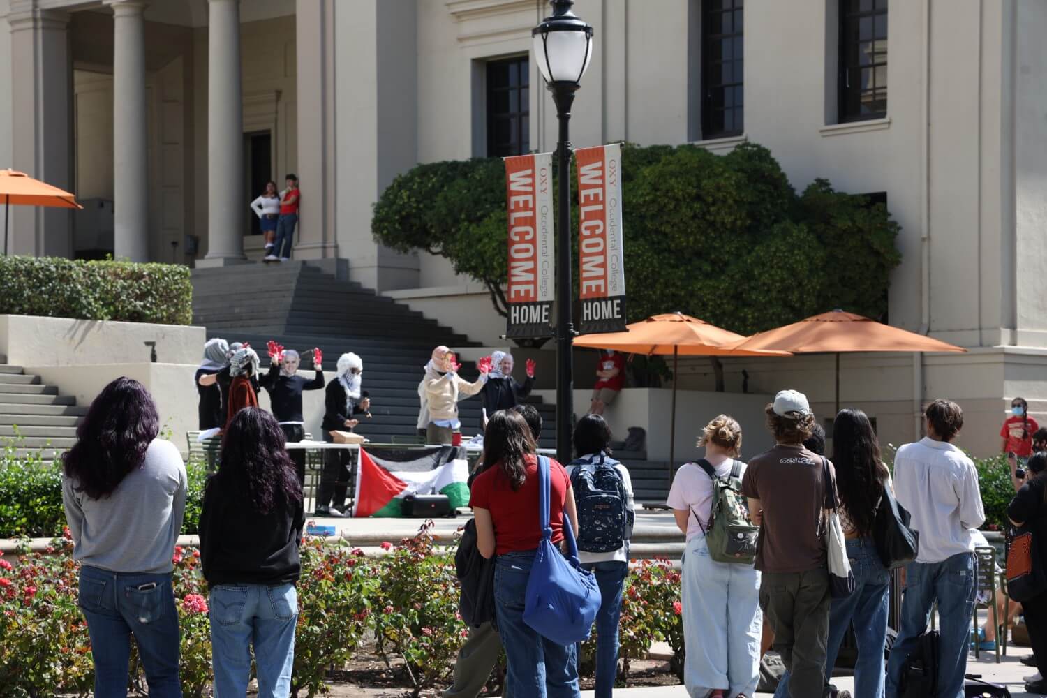 Over 30 Occidental Students for Justice in Palestine (Oxy SJP) members gathered on the Academic Quad near the Gilman Fountain for a rally Oct. 6 at 10:30 a.m. All students were masked, some wore neon reflective vests and carried walkie-talkies. Noise-making contraptions were distributed by Oxy SJP members, including buckets, wind instruments, air horns and a megaphone, as well as ear protection.