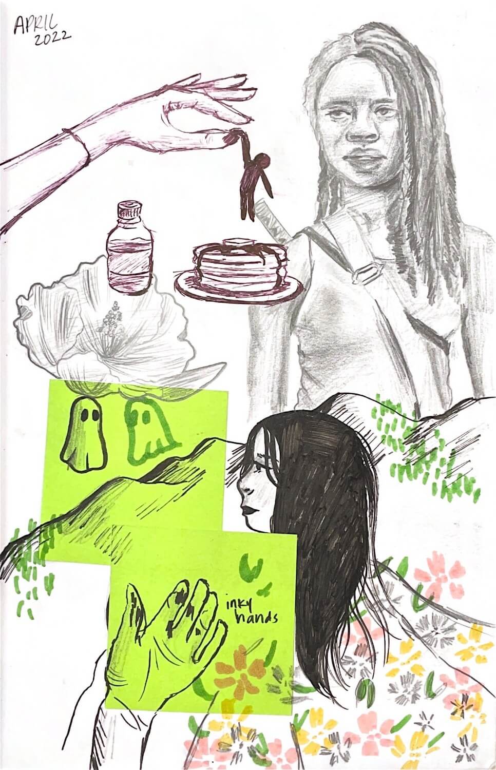 The last page is pretty random, with some doodles and sketches of more “The Walking Dead” characters. The to-do list sticky note was not planned but I had finally crossed everything off so it felt satisfying to stick it on there.On this first page, on the left, I chose some random subject from Pinterest, doodled some weird cats, sketched some nature and, of course, had to include a small Taylor Swift drawing. On the following page of this spread I took another picture or two from Pinterest, and added some fun doodles in the white spaces. The bottom two portraits from left to right are Phoebe Bridgers (again, of course) and Dev Patel, respectively.This first spread of my sketchbook includes a variety of mediums: Ballpoint pen, pencil, ink and more. The sticky notes are not always planned, and mostly used when I need to cover up a mistake or two, but I love the pop of color they bring to the page.The second page of this spread is pretty much a dump of the things I noticed around me. Michonne from “The Walking Dead,” my favorite show, is on the top right, along with an ink drawing I did while on my Japanese Woodblock Print Zoom. The rest is definitely just random doodles that don’t make a ton of sense (a recurring theme in my sketchbook).On this specific page I included some portraits. I have three subjects I usually choose to draw: My friends, famous people (artists and actors) or random people from Pinterest. Occasionally, I just conjure up a random face, which is what I did for the sticky note side profile on the bottom left. Besides that, I drew my friend Katie, Phoebe Bridgers and loosely referenced my friend Meg for that tiny profile in the middle. And of course, nature is always perfect to fill those awkward spaces.